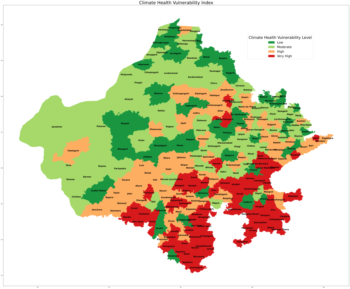 One of the unique benefits of CHIP is that it uses geospatial intelligence to map health inequities and allocate resources efficiently. By analyzing the first village-level multidimensional poverty indices, travel times to healthcare facilities, and disease hotspots, CHIP enables health officials to address systemic gaps. It has been instrumental in identifying high-risk areas for malnutrition, tuberculosis, and vector-borne diseases such as dengue and malaria. Furthermore, through its Climate Health Vulnerability Index (CHVI), CHIP integrates environmental, socioeconomic, and health datasets to anticipate climate-sensitive health risks, such as air pollution, heat stress, and vector-borne illnesses. These insights guide actionable interventions, down to the block level.